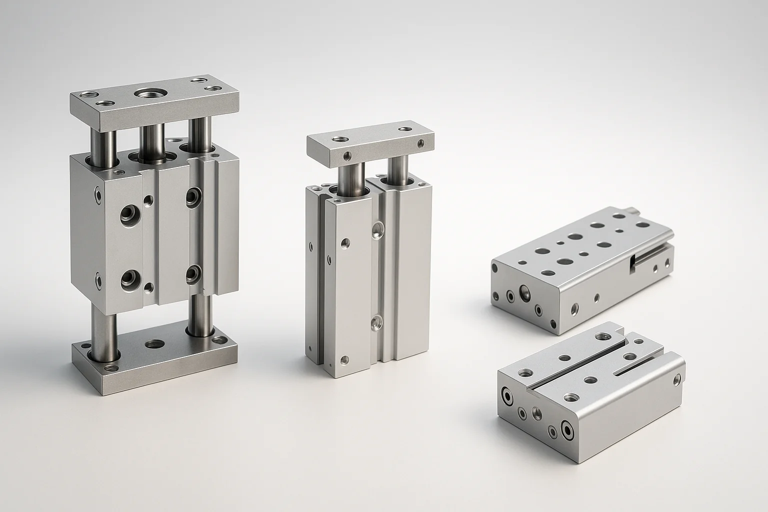 Les vérins guidés associent la conception compacte des actionneurs pneumatiques standard à un guidage mécanique renforcé, garantissant un mouvement parallèle, une stabilité accrue et une meilleure résistance aux forces de torsion. Ils sont largement utilisés dans les environnements où le positionnement précis, la répétabilité et la durabilité sont essentiels, comme les unités pick-and-place, les opérations de pressage et les tâches de serrage.